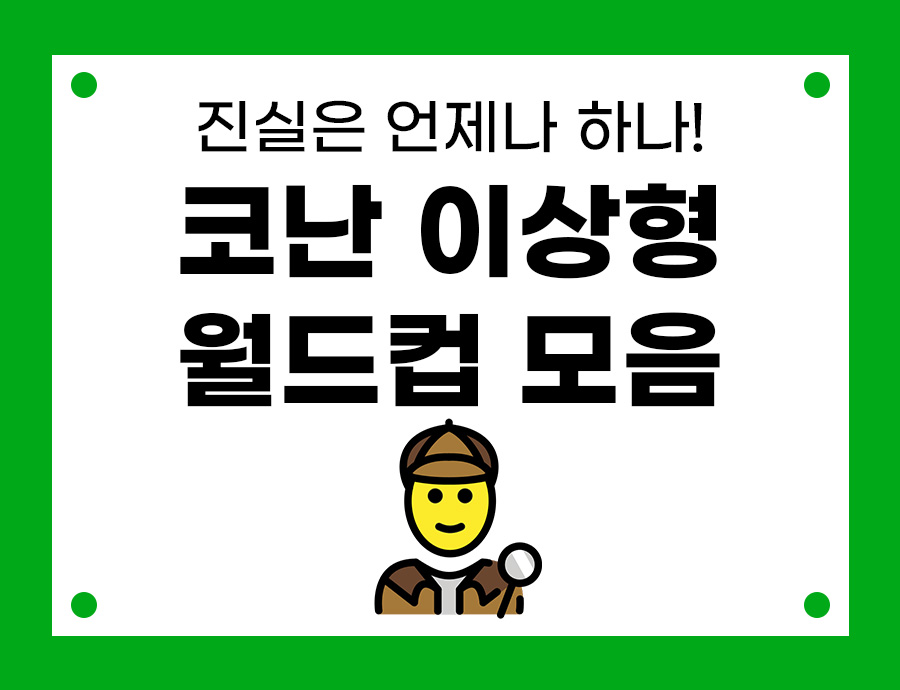 심심할 때 해보기 좋은 코난 이상형 월드컵 각종 모음집을 들고 왔습니다! 친구들과 연인, 혹은 가족이나 시청자와 함께 즐거운 시간 되시길! 그럼 시작-!