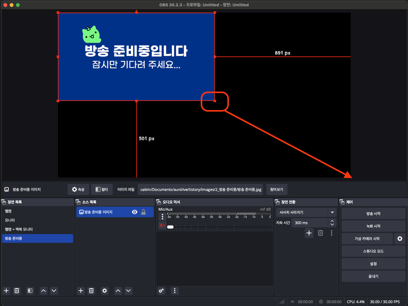 송출 화면보다 이미지가 작다면, 오른쪽 아래 빨강 네모를 끌어 당겨 비율을 맞춰 주세요.