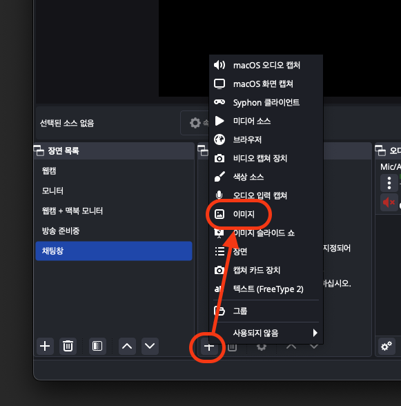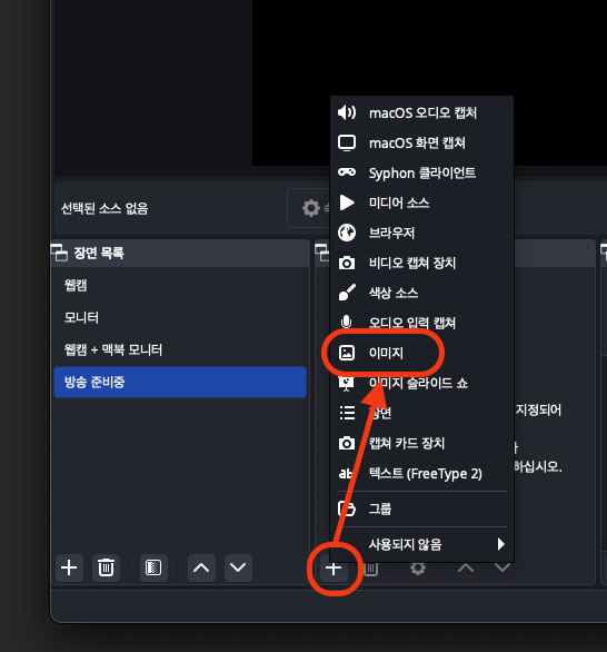 '소스 목록'에서 +를 눌러 이미지를 클릭해 주세요.