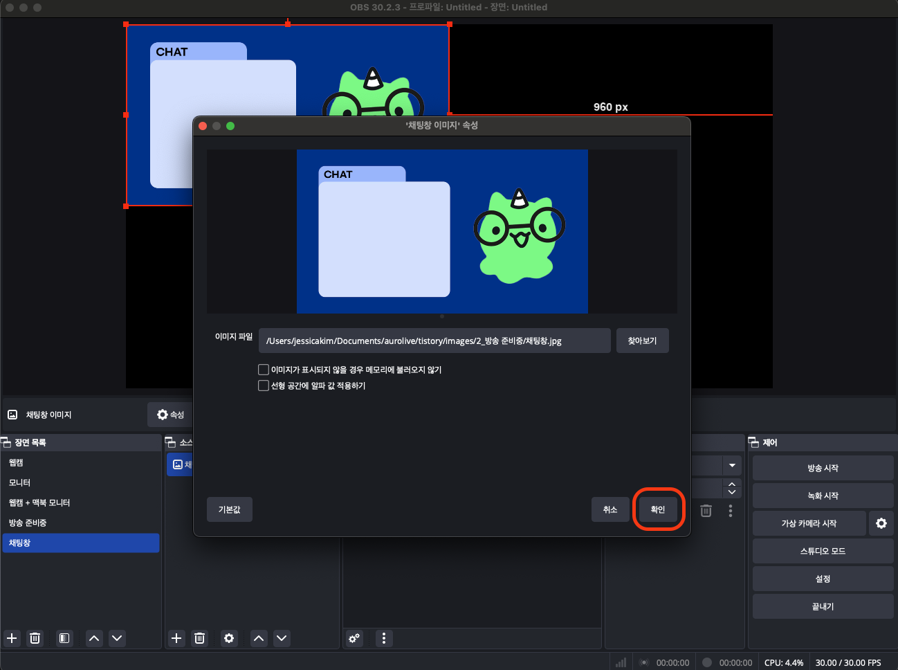 이름을 '채팅창 이미지'로 바꿔주고, 확인을 눌러주세요.
