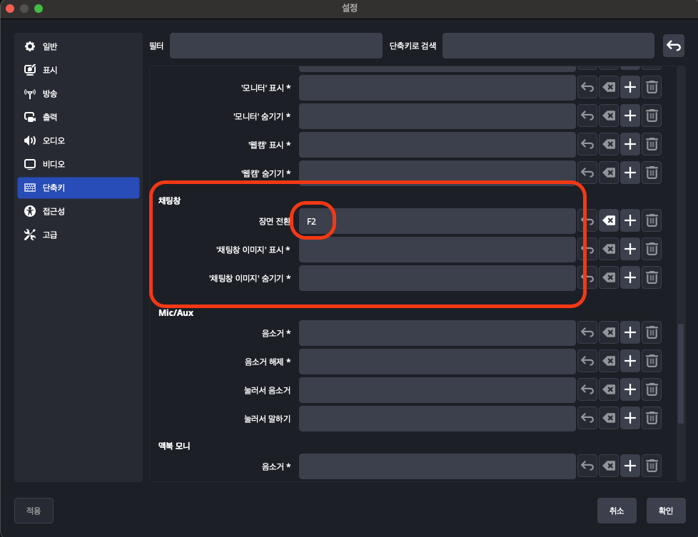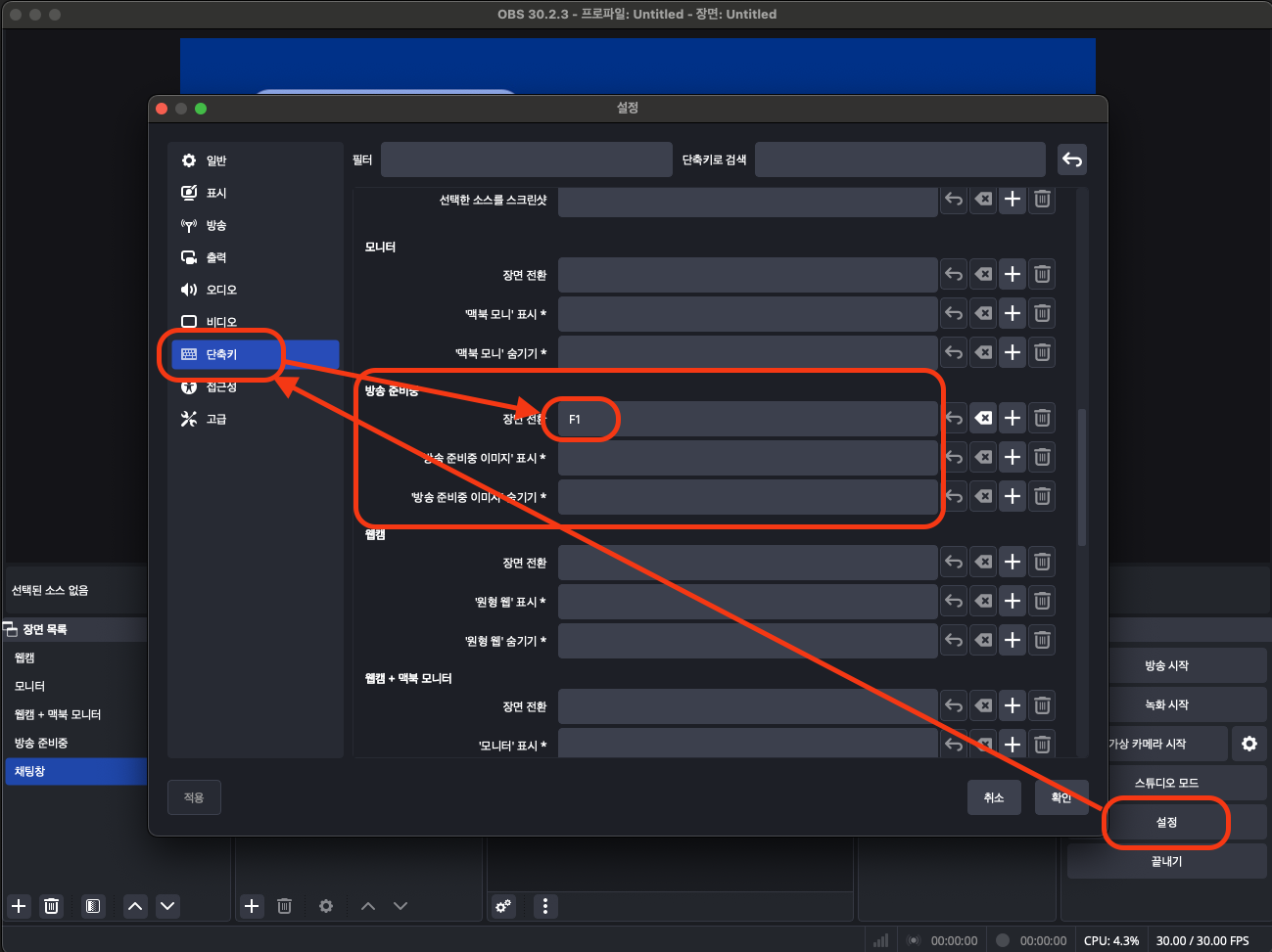 설정 👉 단축키 👉 '방송 준비중' 👉 장면 전환에서 원하는 키보드의 키를 눌러줍니다.