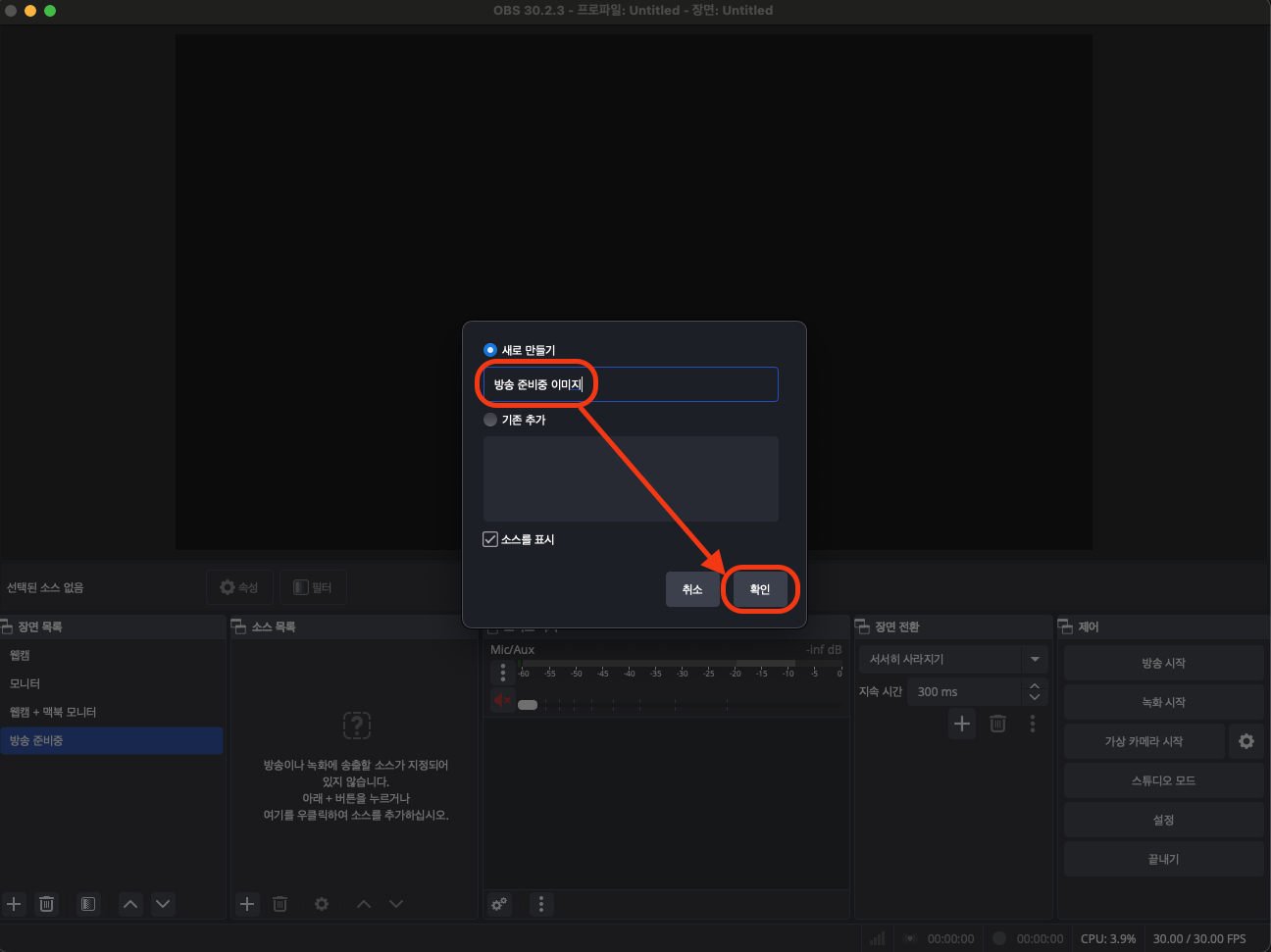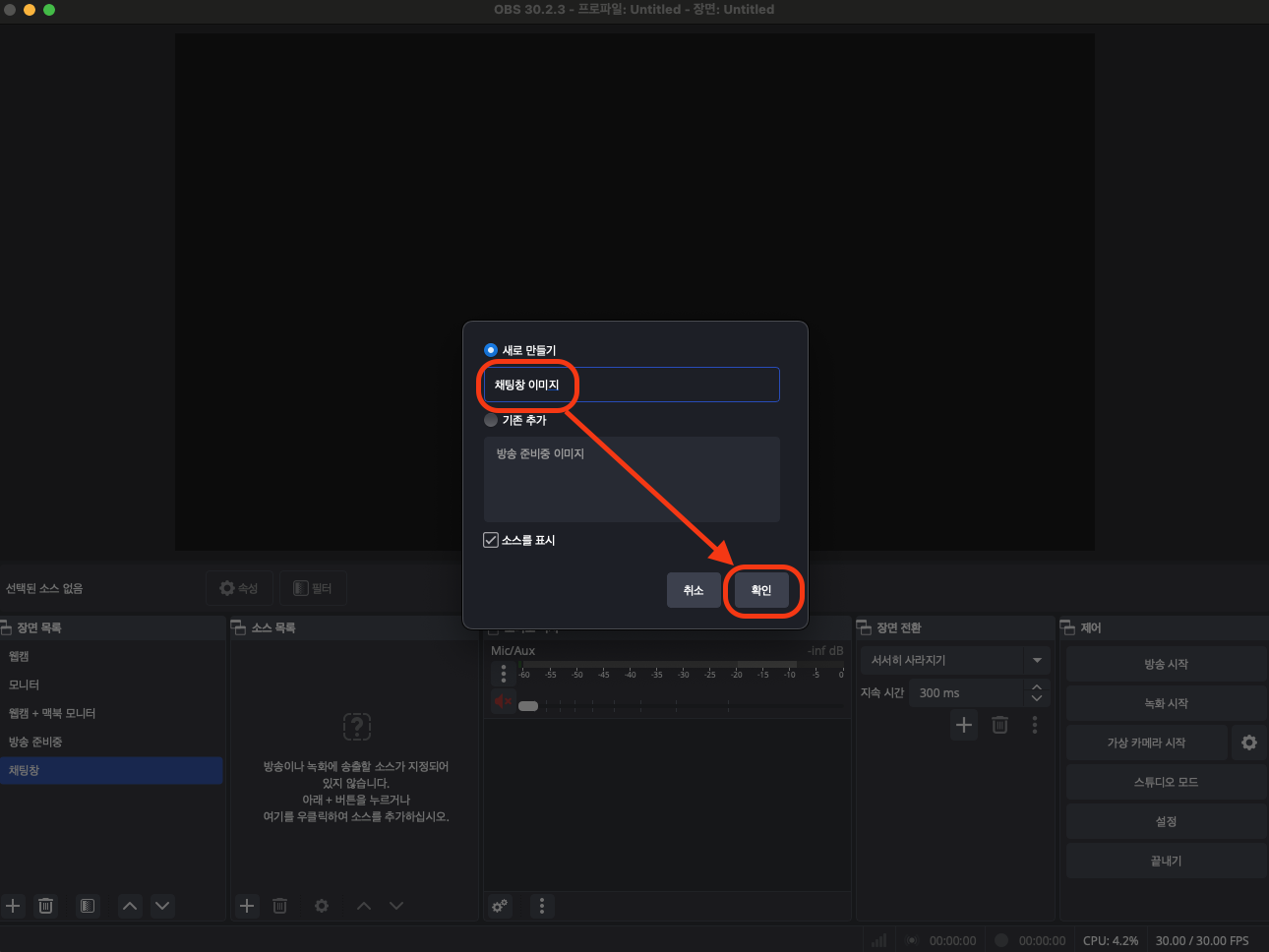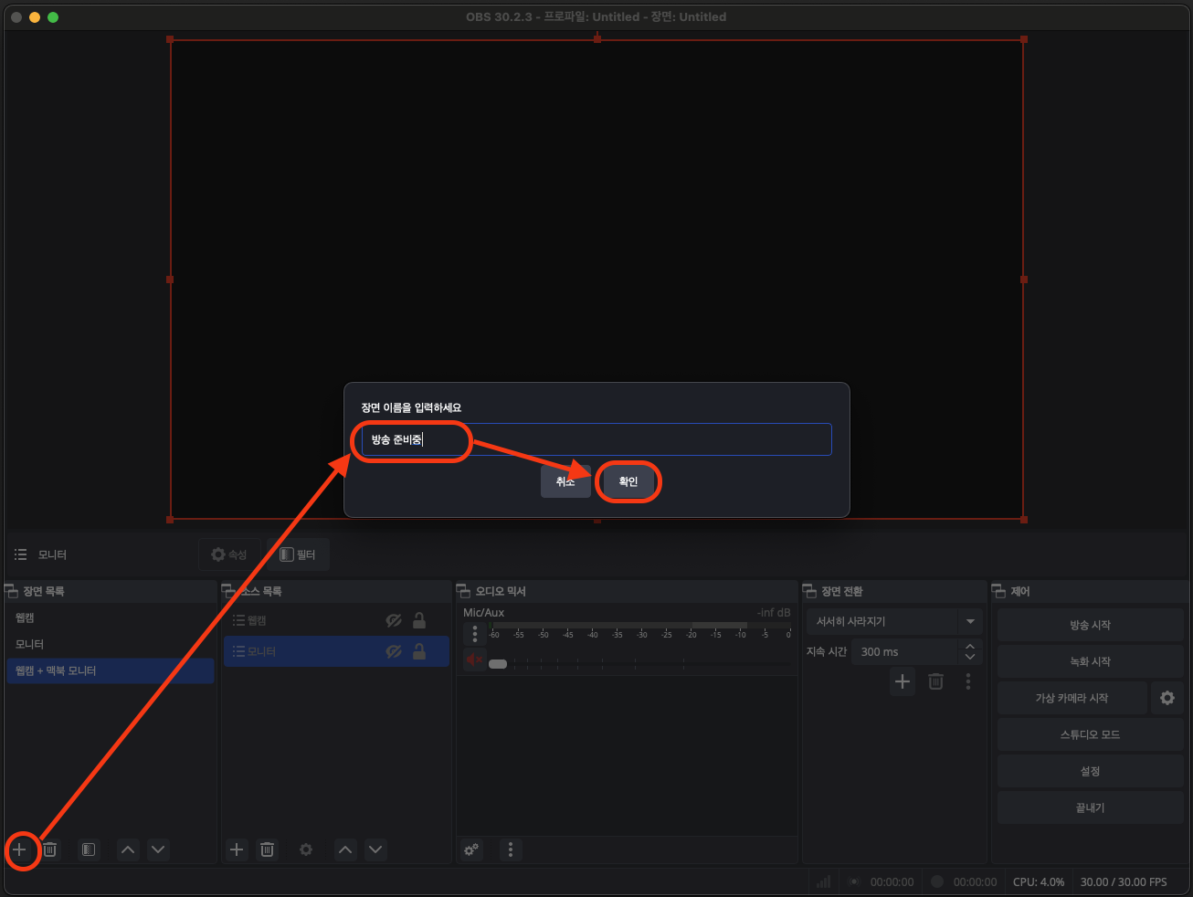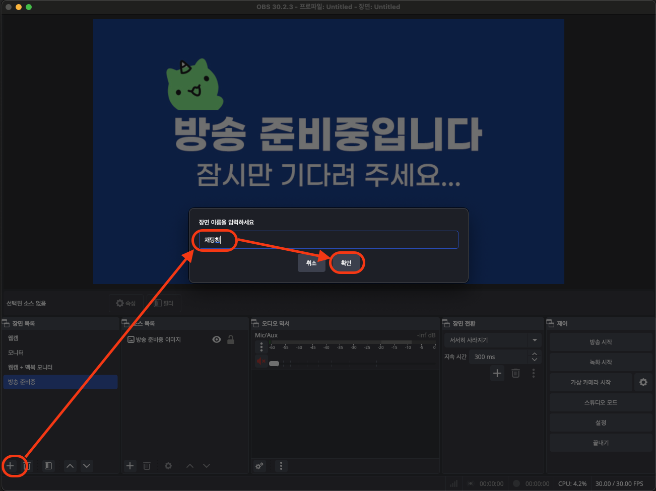 OBS를 켜시고, 제일 왼쪽 아래 +를 눌러 장면 이름을 변경해 주세요.