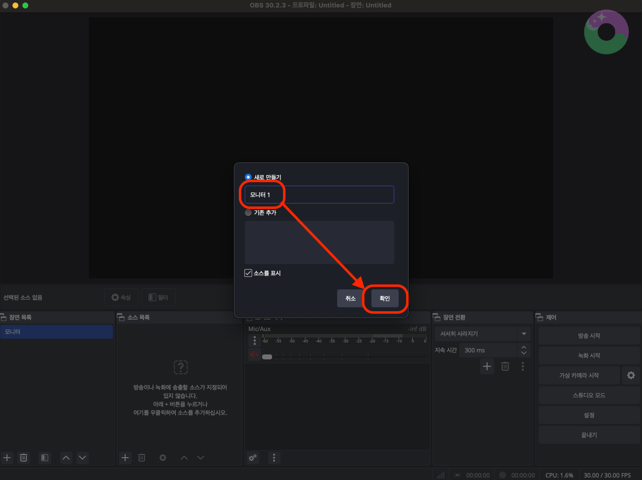 '장면 목록'에서 +버튼을 누르고, 이름을 바꿔 확인을 눌러주세요.