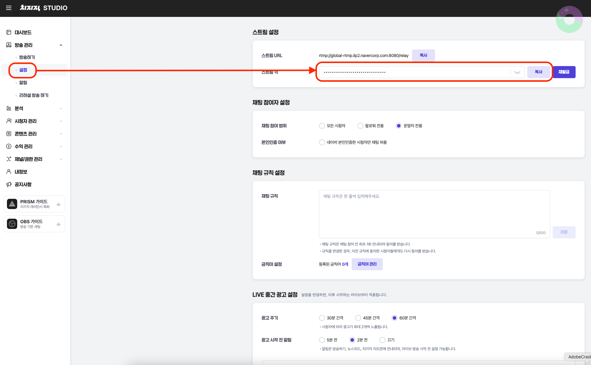 설정 👉 방송 👉 서비스 치지직으로 변경하고 👉 스트림 키를 붙여넣기 해줍니다.