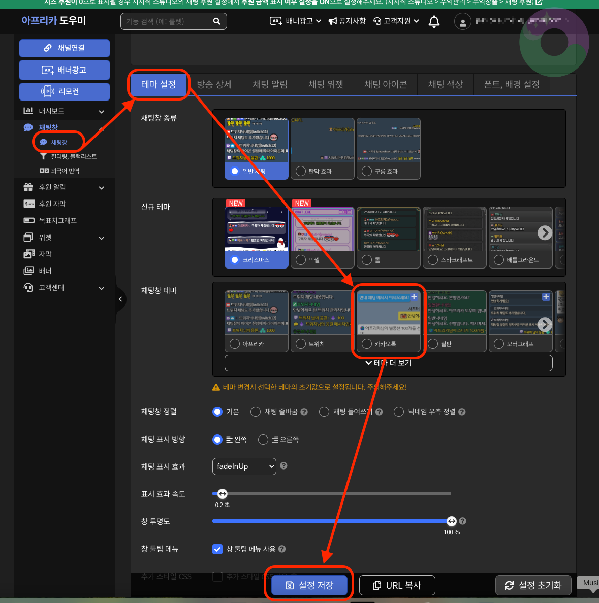 왼쪽에 채팅방을 클릭하고, 테마 설정 👉 원하는 테마 클릭 👉 설정 저장 클릭