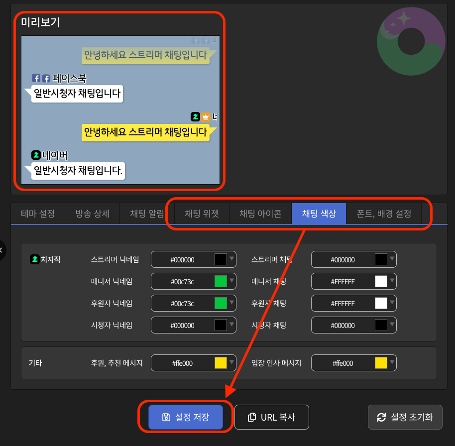 방송 화면을 보면서 채팅 설정을 원하시는 데로 바꿔 주시면 됩니다.