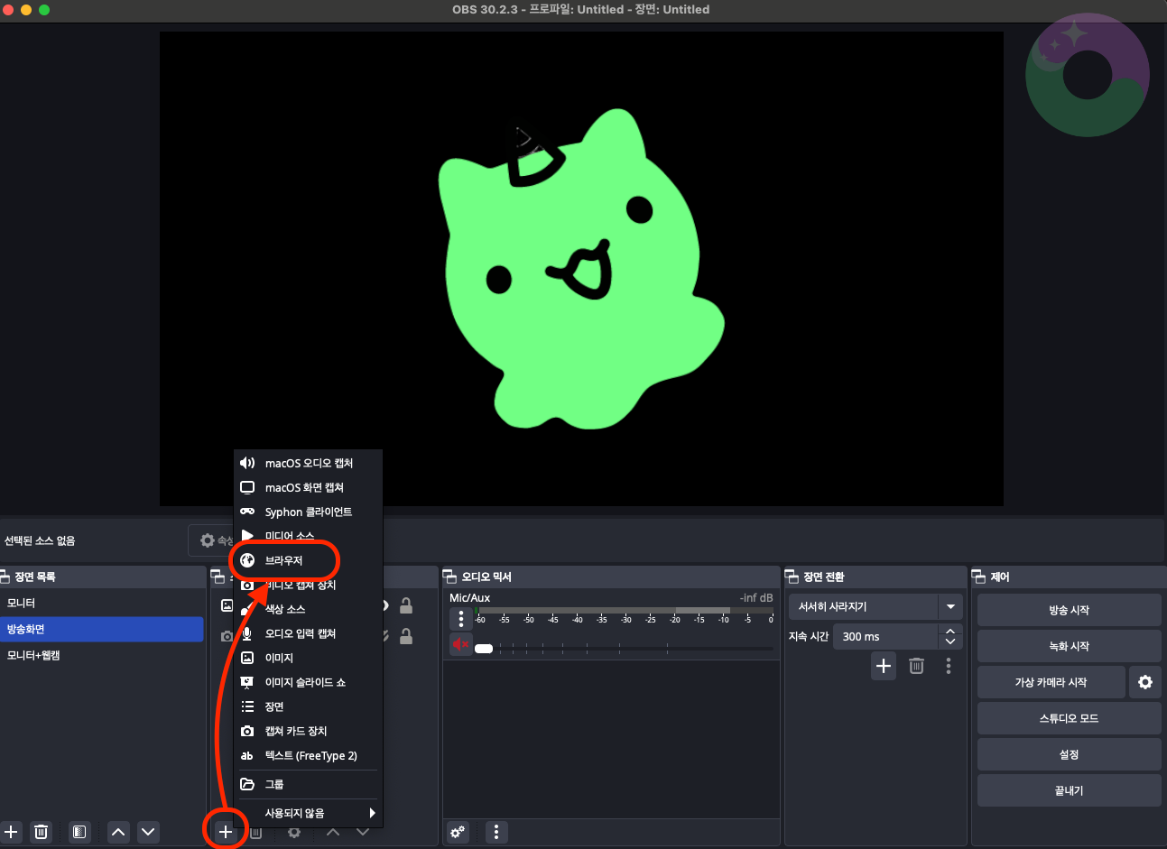이제 OBS를 켜주세요. 소스 목록에서 +를 누르고, 브라우저 클릭