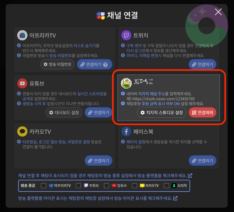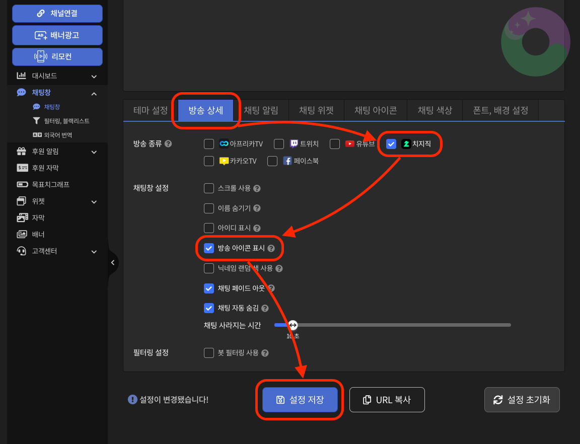 옆에 방송 상세 클릭 👉 원하는 방송 종류 클릭 👉 채팅창 설정 확인 👉 설정 저장 눌러주세요.