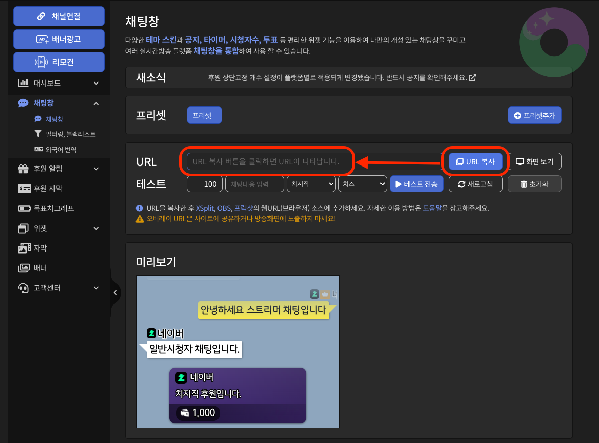 아프리카도우미 채널프렌드 채널애드 XSplit, OBS, 아프리카TV 프릭샷의 웹브라우저 URL을 활용하여 아프리카 트위치 유튜브 카카오TV 네이버TV 치지직 페이스북의 채팅창과 선물 내용을 다양한 스