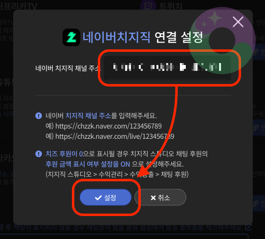 아까 복사해 둔 자신의 채널 url을 이곳에 붙여넣기 해 주고, 설정을 클릭해 줍니다.
