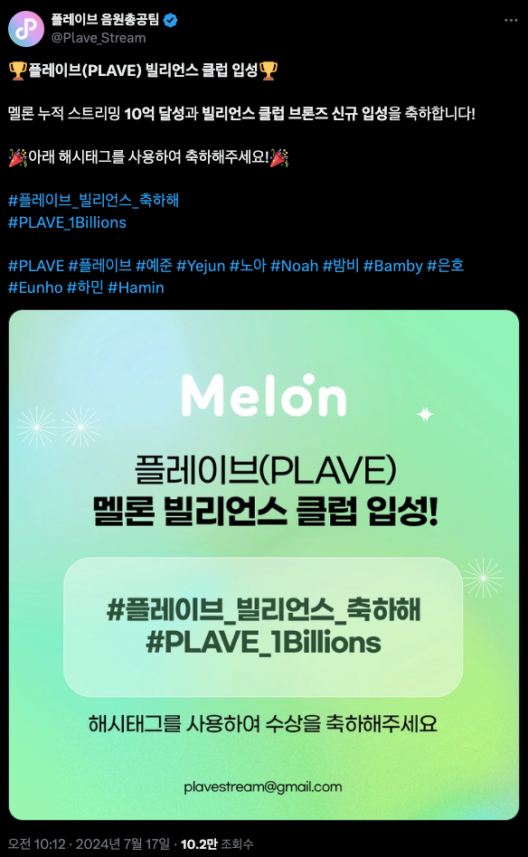 - 플레이브는 멜론의 빌리언스 클럽에 역대 최단기간으로 이름을 올리는 대기록을 달성했습니다.