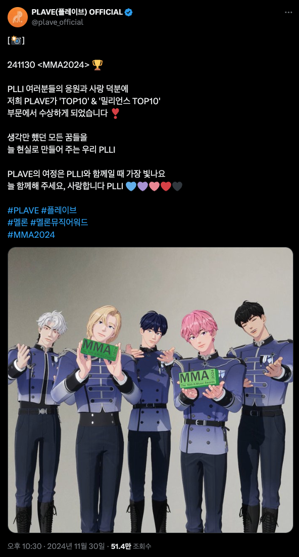 오늘은 버추얼 아이돌 그룹, 플레이브의 2024 멜론뮤직어워드 2관왕이 소식을 전해드리겠습니다!