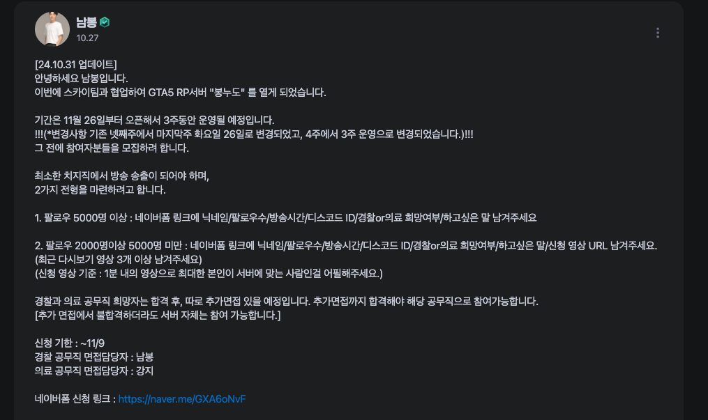 오늘은 최근 큰 인기를 끌고 있는 GTA5 RP 서버 봉누도에 대해 이야기해 보려고 해요.