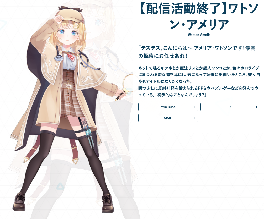 홀로라이브 영미권 멤버인 왓슨 아멜리아도 2024년 9월 30일 활동 종료를 선언했으나,
