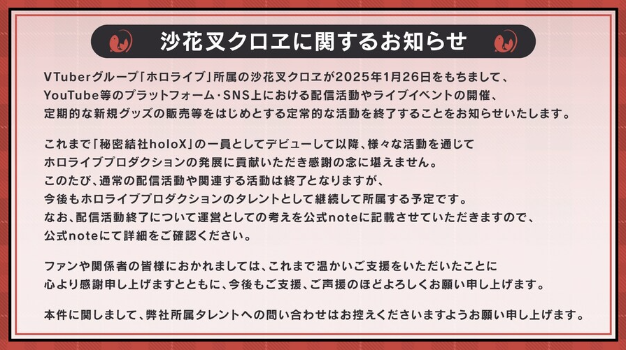VTuber 그룹 ‘홀로라이브’ 소속인 사카마타 클로에가 2025년 1월 26일을 기점으로,