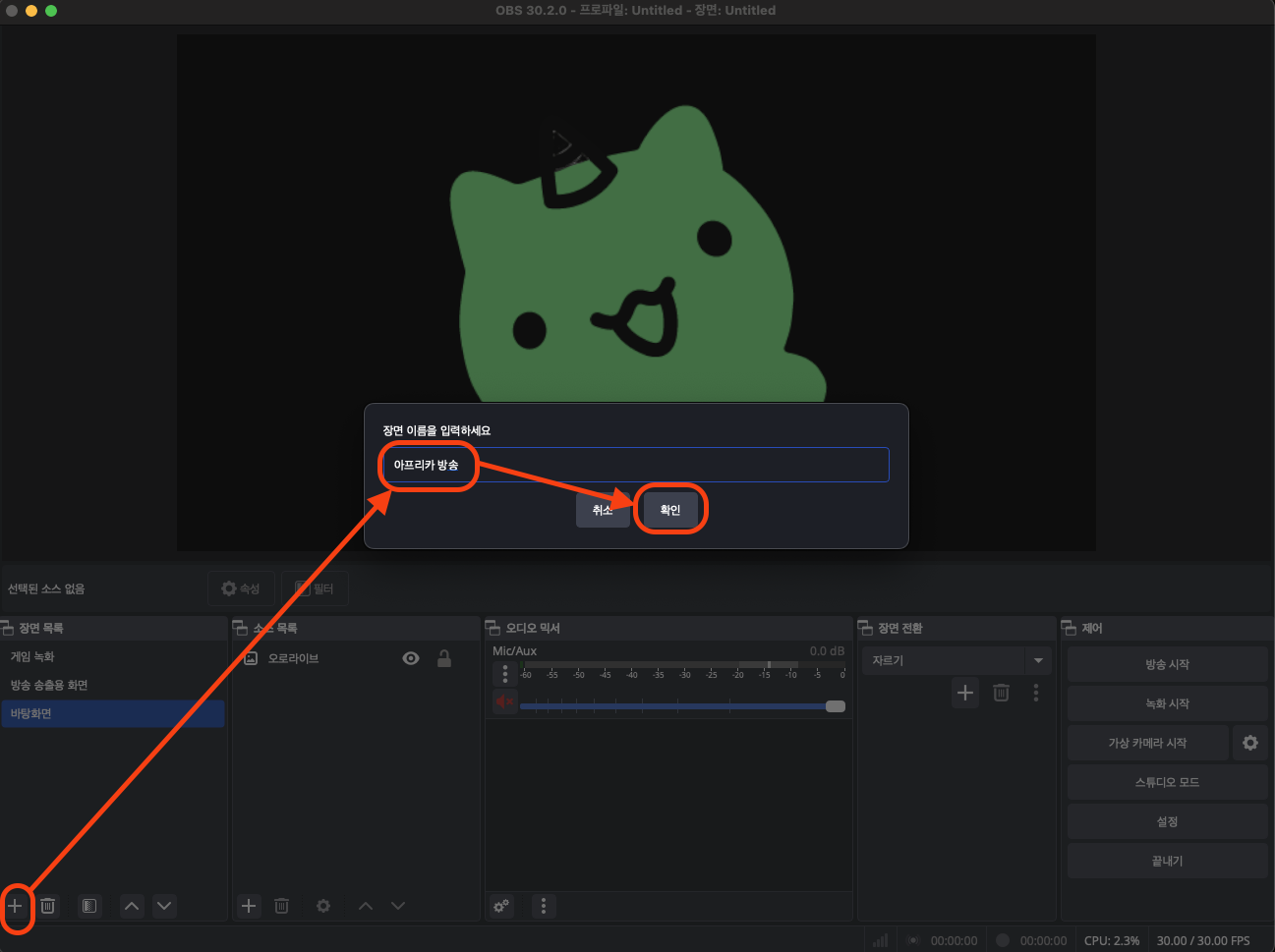 장면 목록에서 +  👉 이름 변경 👉 확인