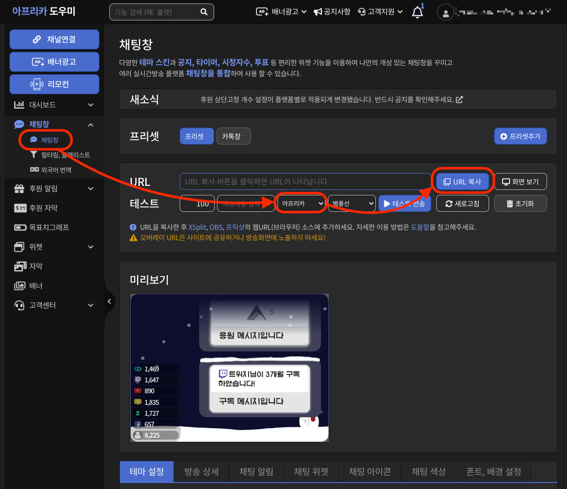 아프리카 도우미에서 후원 자막 👉 아프리카 👉 URL 복사
