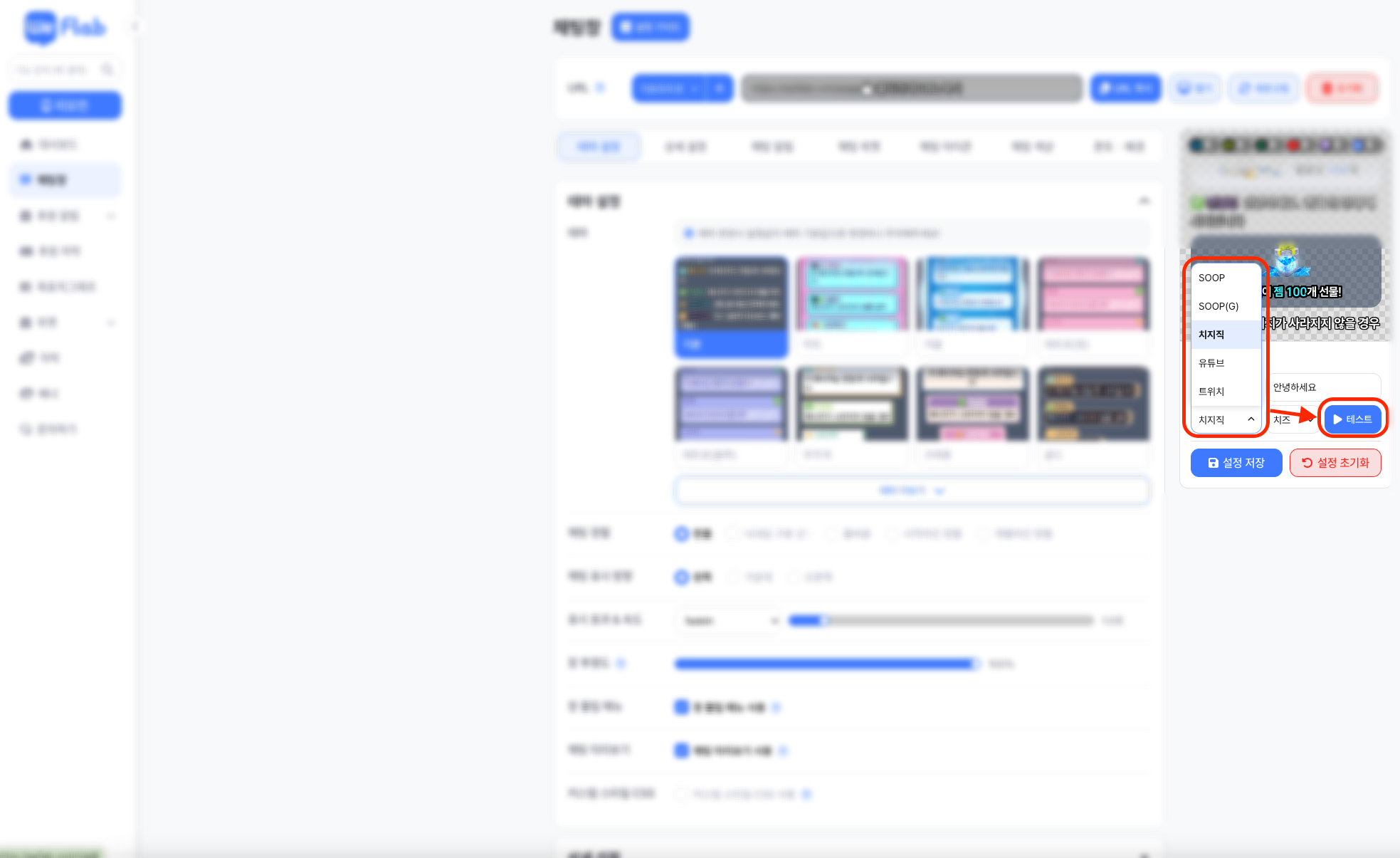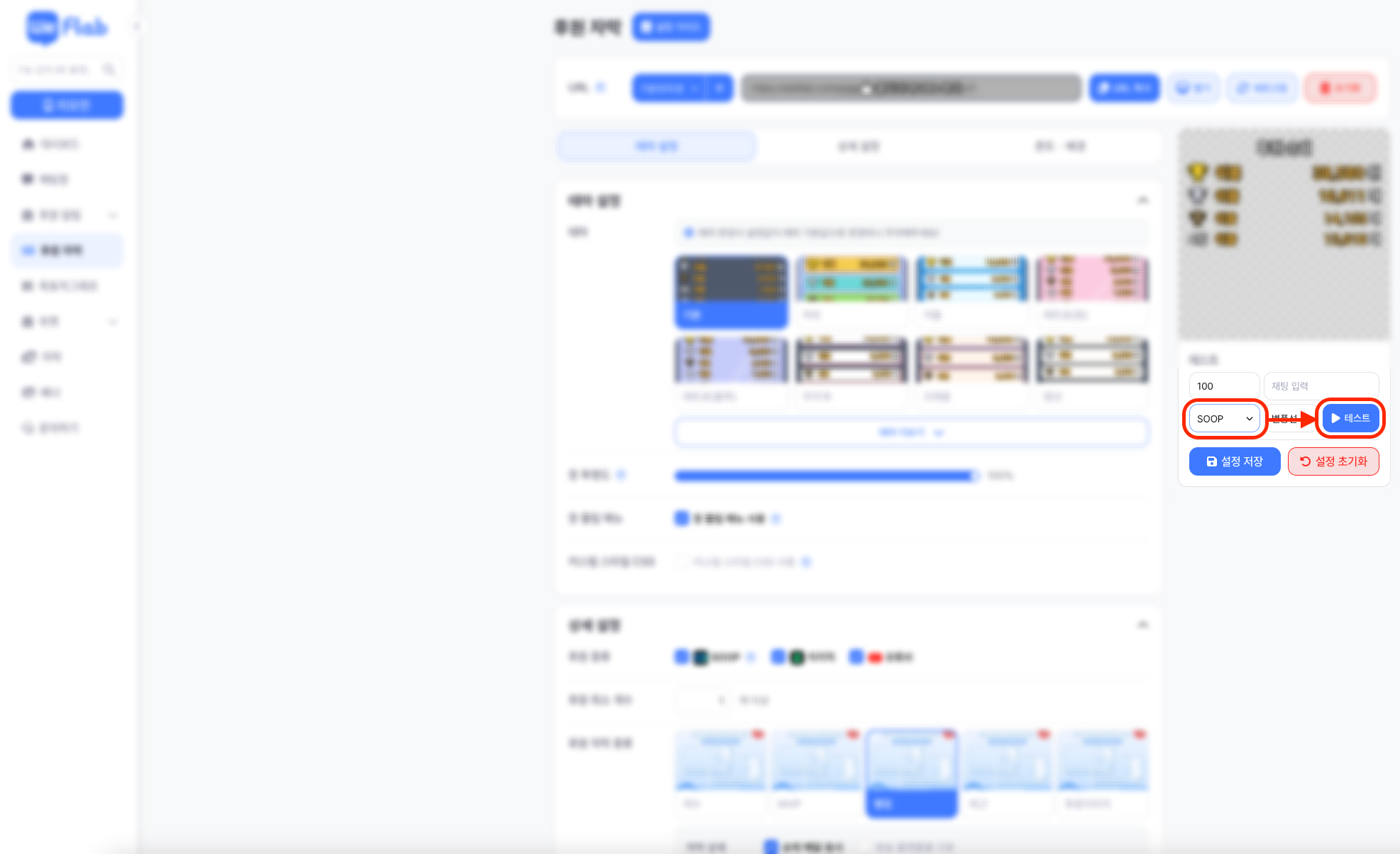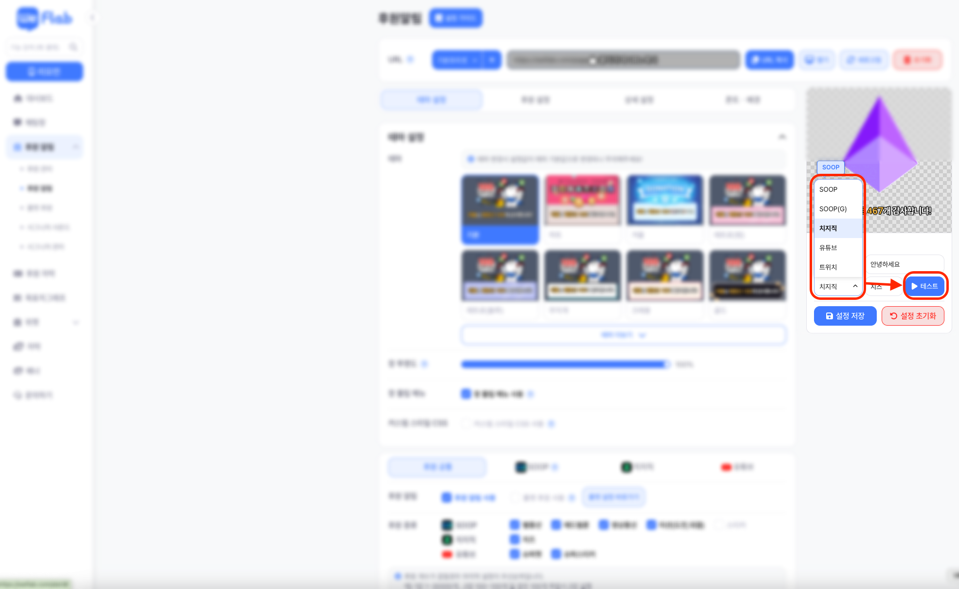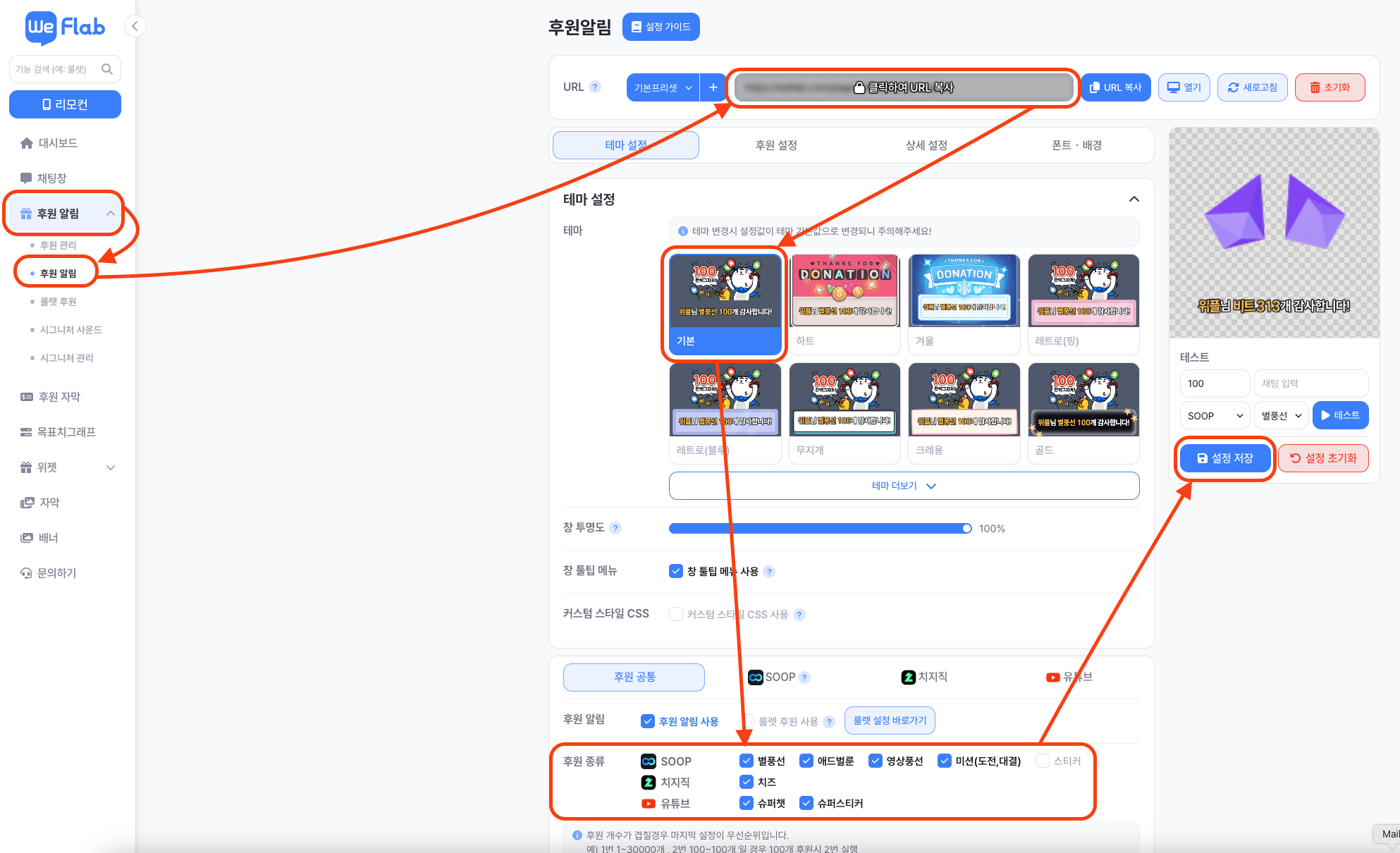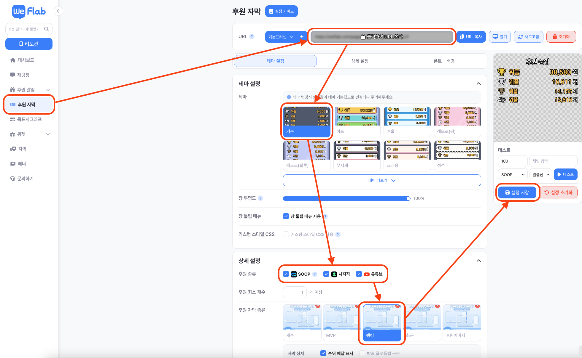 후원 자막 👉 URL 복사 클릭 👉 테마 설정 👉 후원 종류 설정 👉 설정 저장