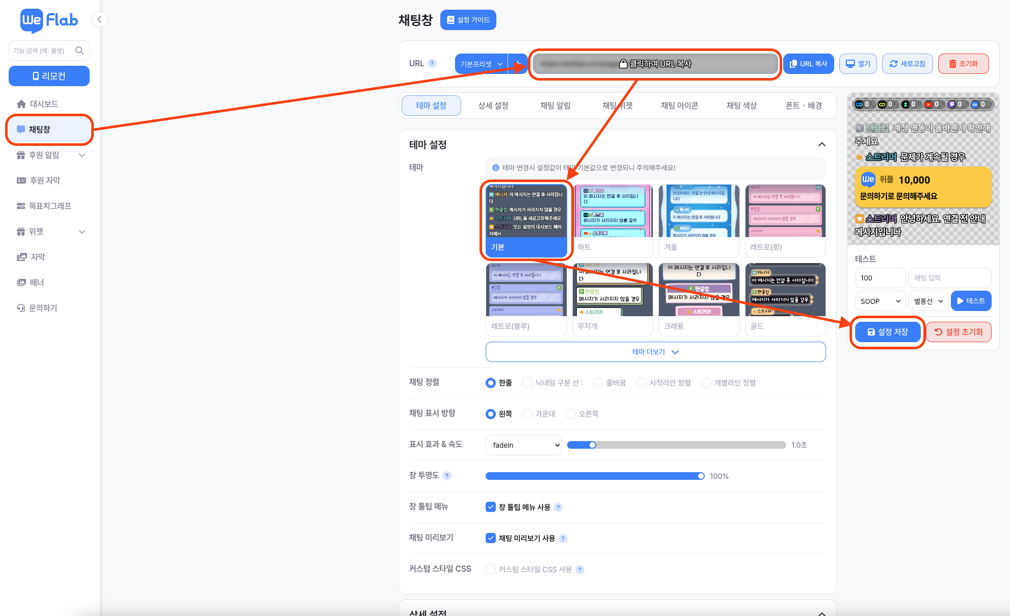 채팅창 👉 url 복사 👉 테마 설정 👉 설정 저장