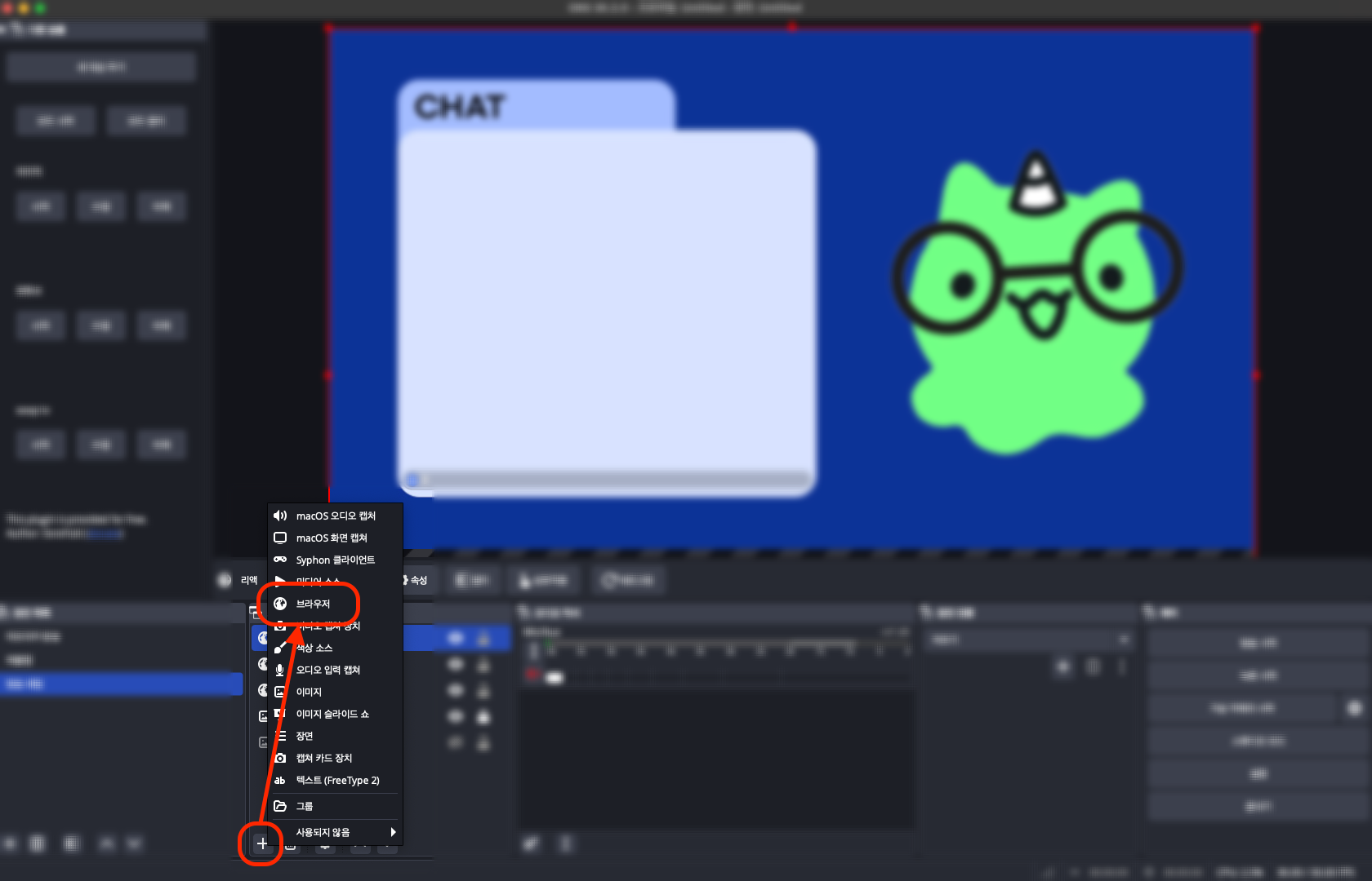 OBS에서 소스 목록 👉 + 👉 브라우저