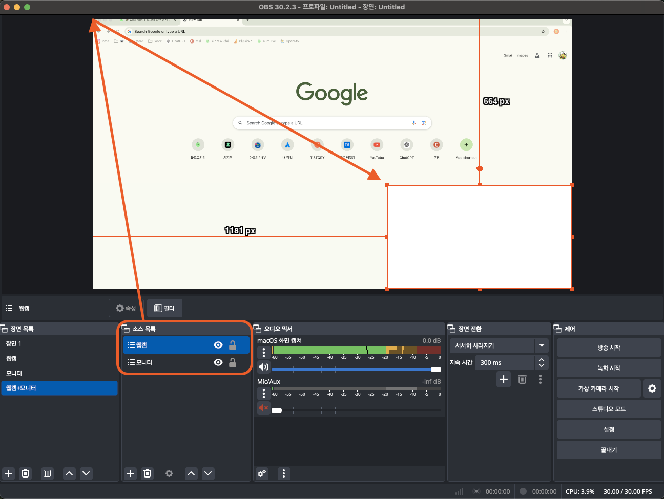 또 소스 목록에서 +를 눌러 '모니터'를 클릭하고 확인을 누르세요.