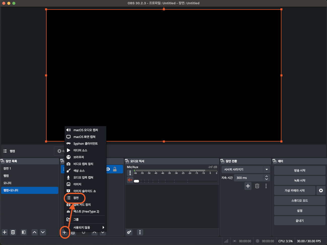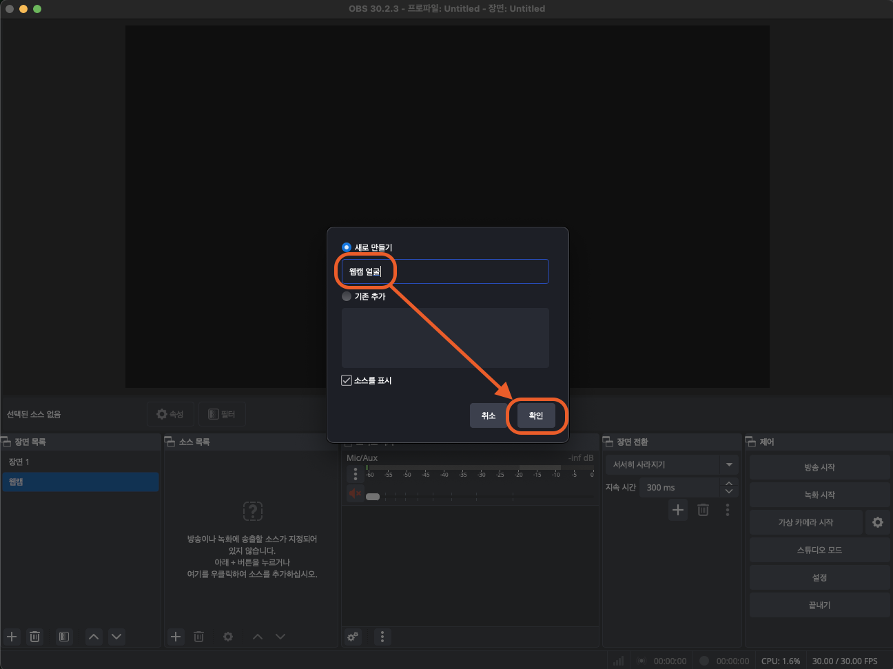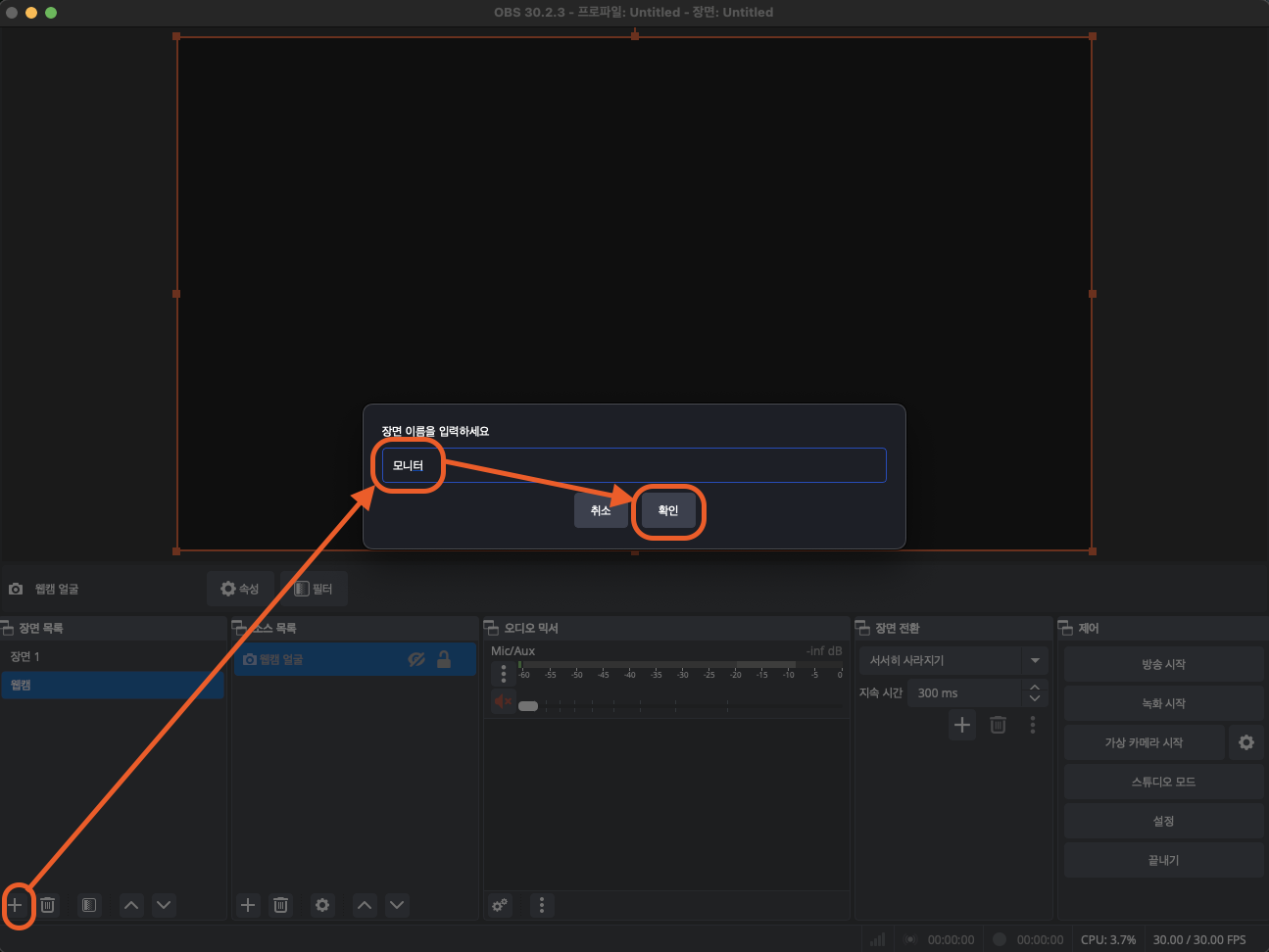 소스목록에서 +를 눌러 '장면'을 클릭하세요.