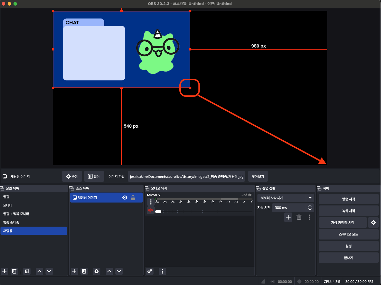 송출 화면보다 이미지가 작다면, 오른쪽 아래 빨강 네모를 끌어 당겨 비율을 맞춰 주세요.