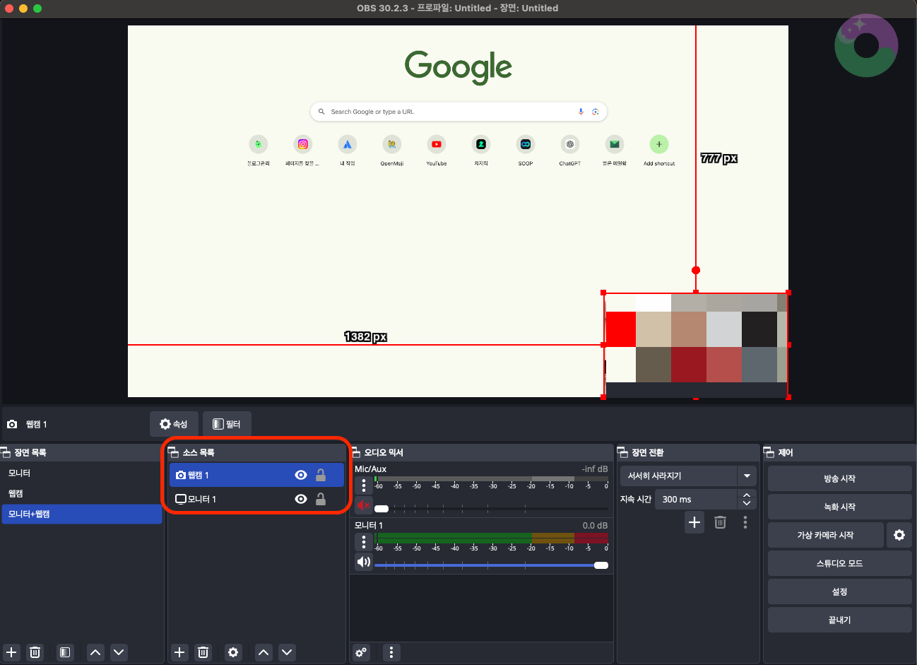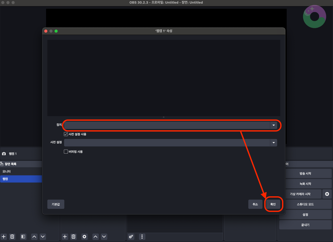 만약 웹캠이 보이지 않는다면, '소스 목록'에서 웹캠과 모니터의 순서를 잘 확인해 주세요.