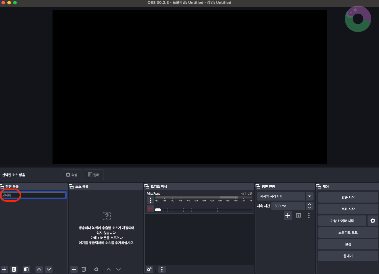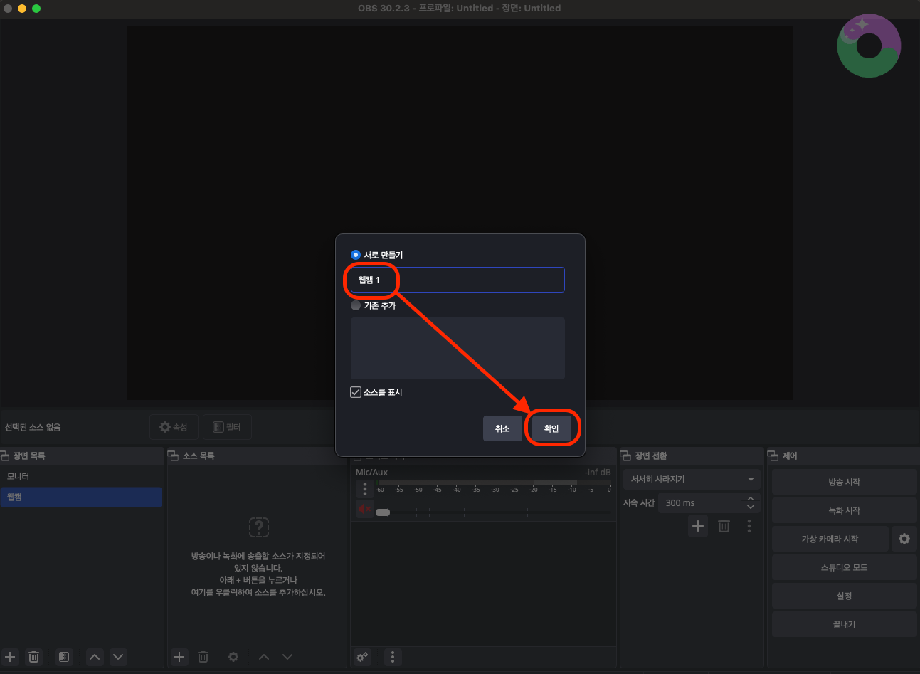 '장면 목록'에서 +버튼을 누르고, 이름을 바꿔 확인을 눌러주세요.
