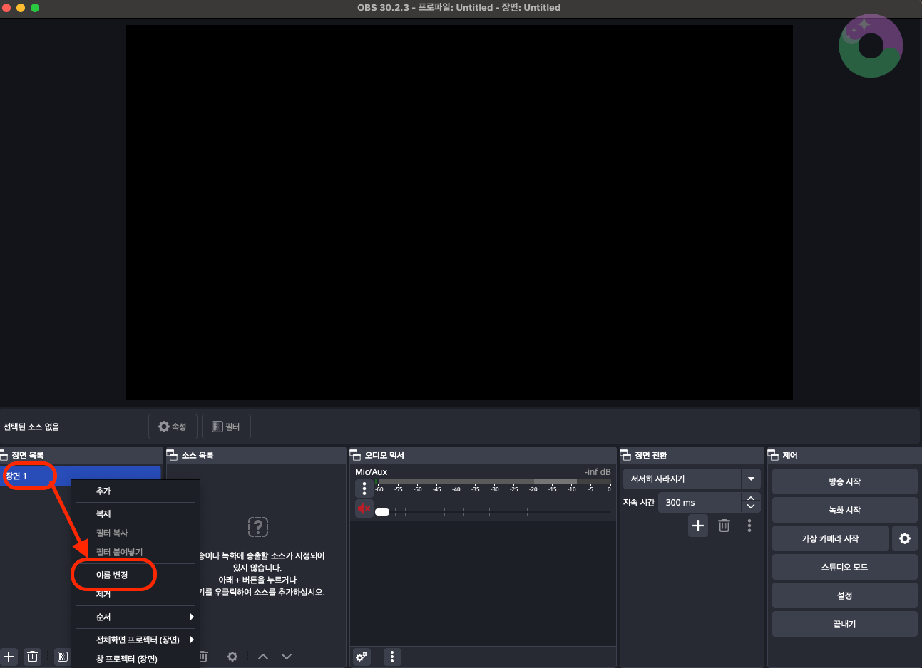 우선 OBS를 처음 켜면 '장면 1'이 생성되어 있을 거예요. '장면 1'에 오른쪽 마우스를 눌러 '이름 변경'을 눌러줍니다.