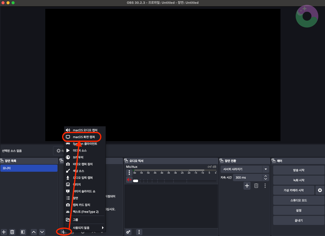 '소스 목록'에서 +버튼을 눌러 'macOS 화면 캡처' (윈도우는 '디스플레이 캡처')를 눌러줍니다.