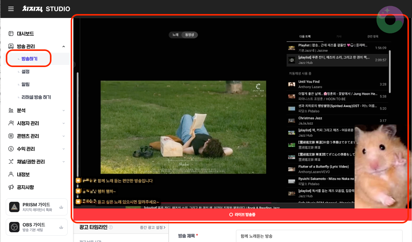방송하기를 눌러, 방송을 시작해 줍니다.