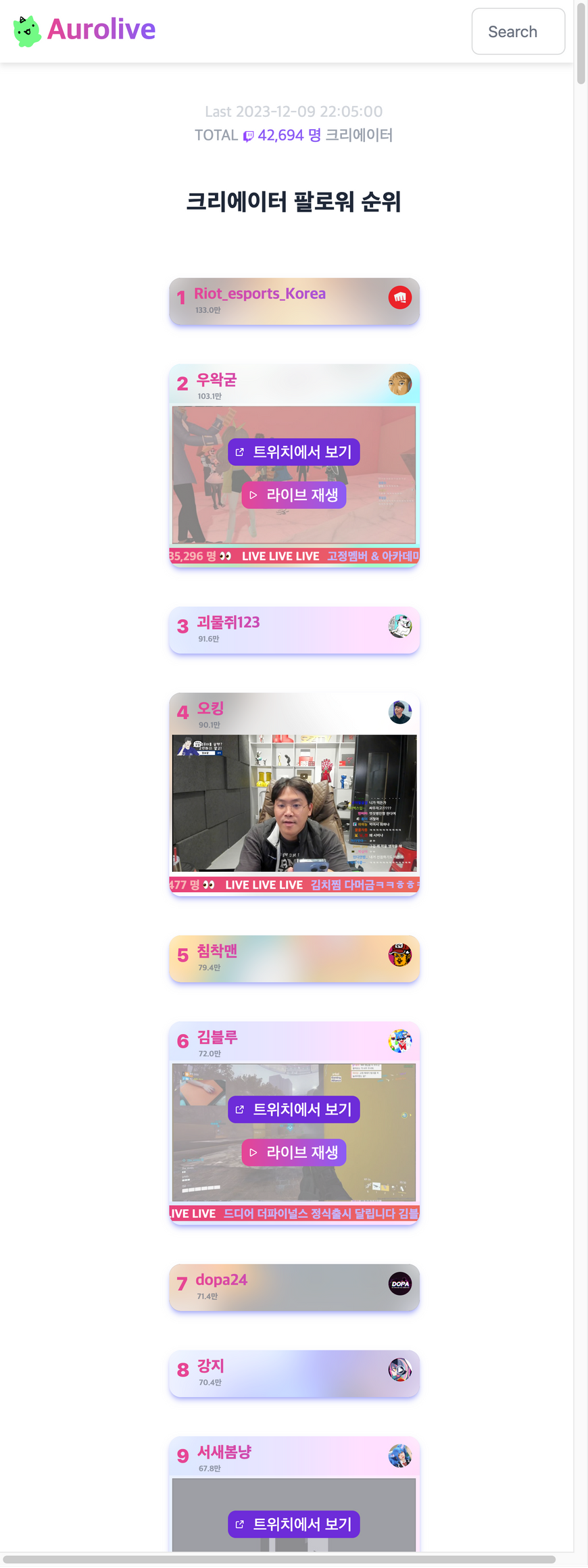 한국 트위치 크리에이터의 팔로워 순위와 라이브 정보를 제공하는 오로라이브의 프리슬라임입니다!