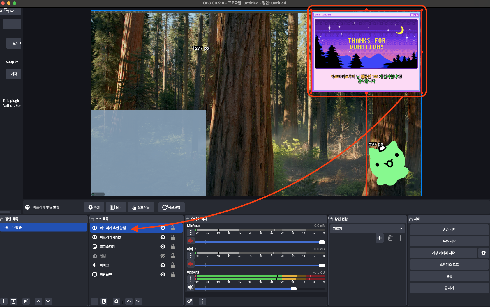 그러면 화면에 별풍선이 테스트용으로 올라오는 것을 볼 수 있습니다.