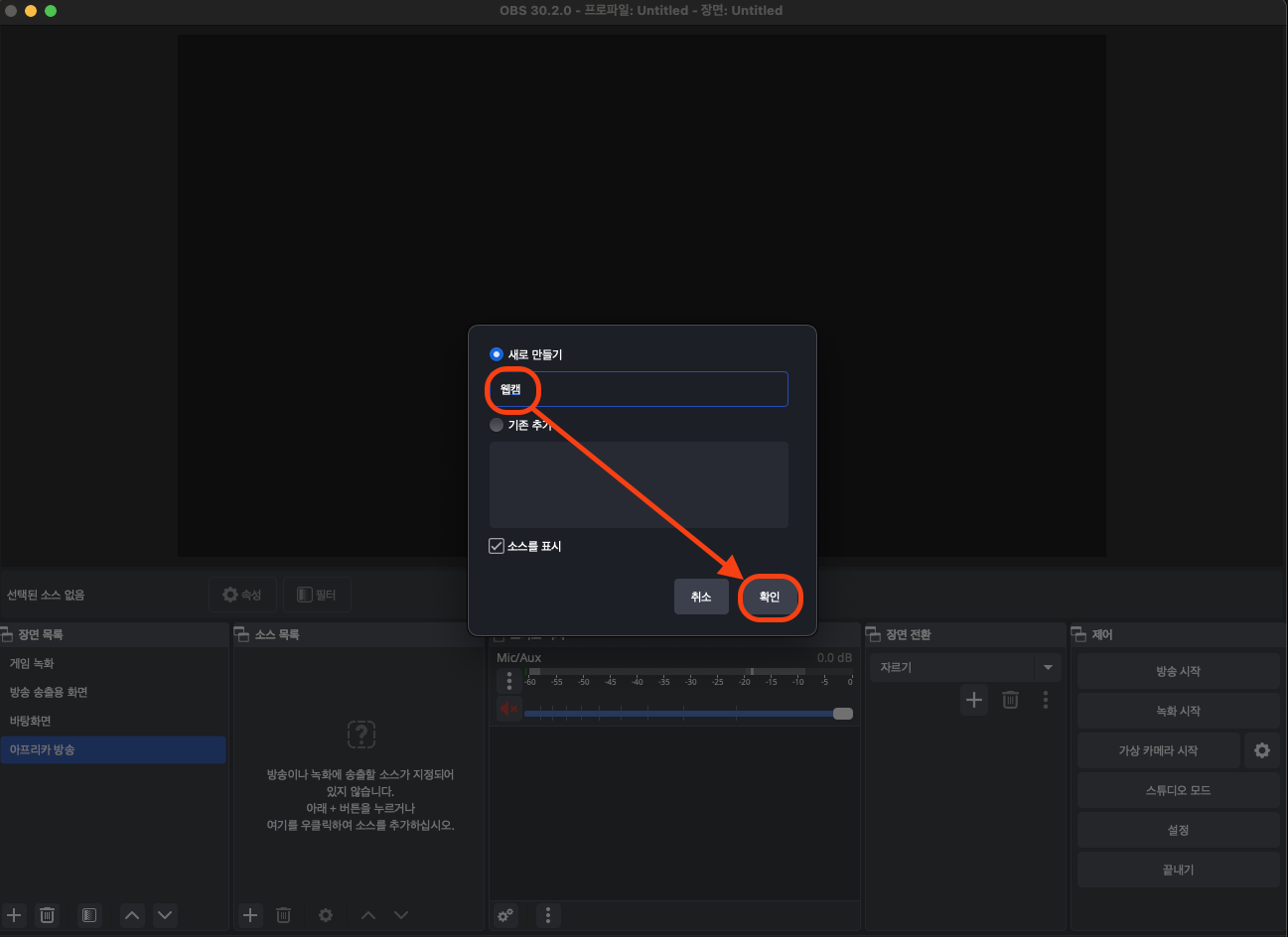 소스 목록 👉 + 👉 비디오 캡쳐 장치