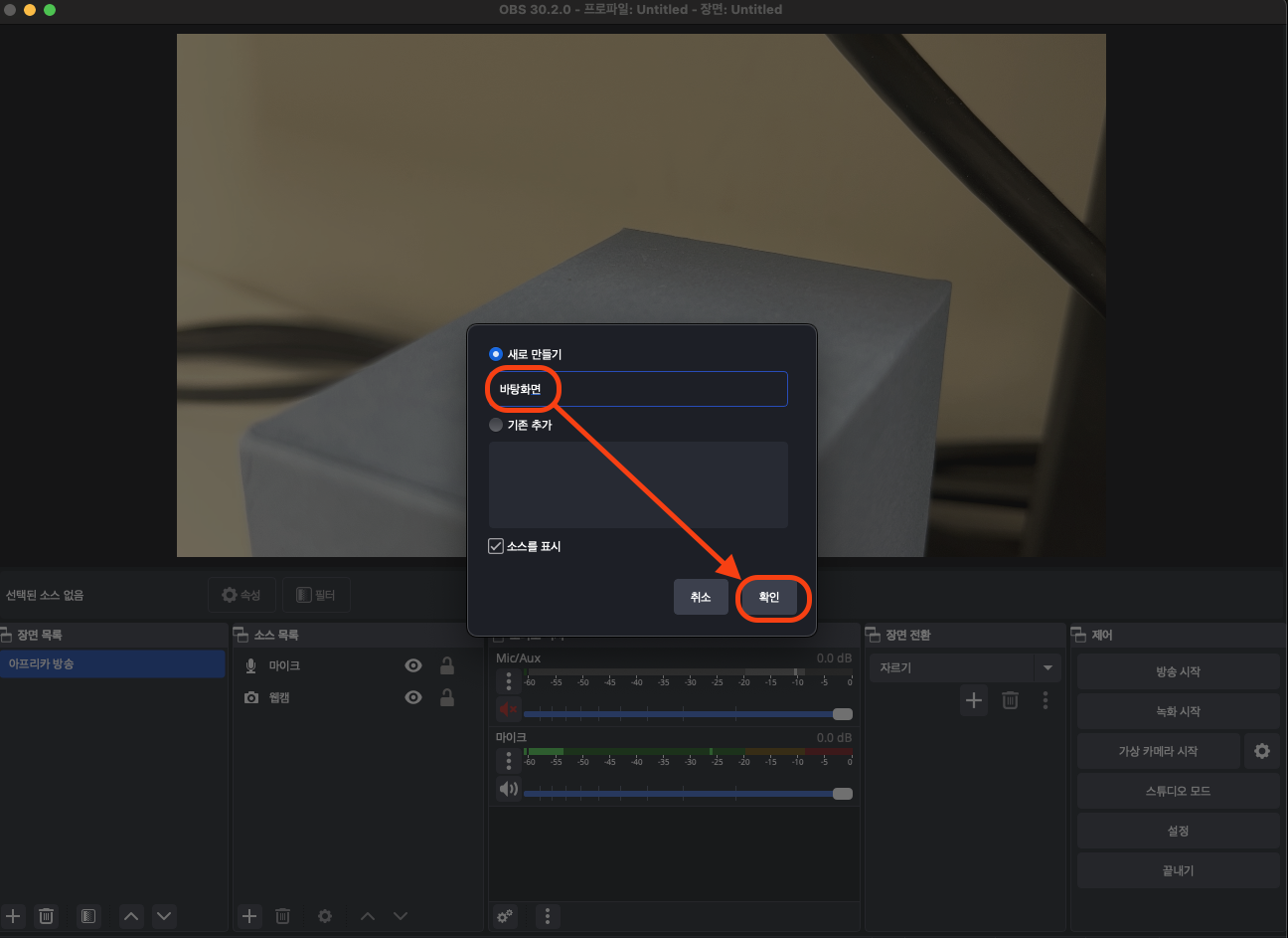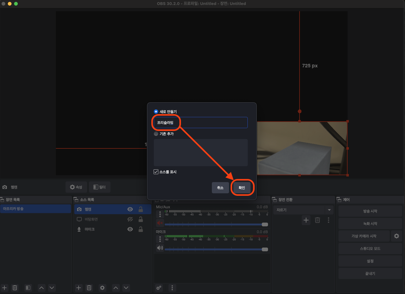 장면 목록에서 + 👉 이름 변경 👉 확인