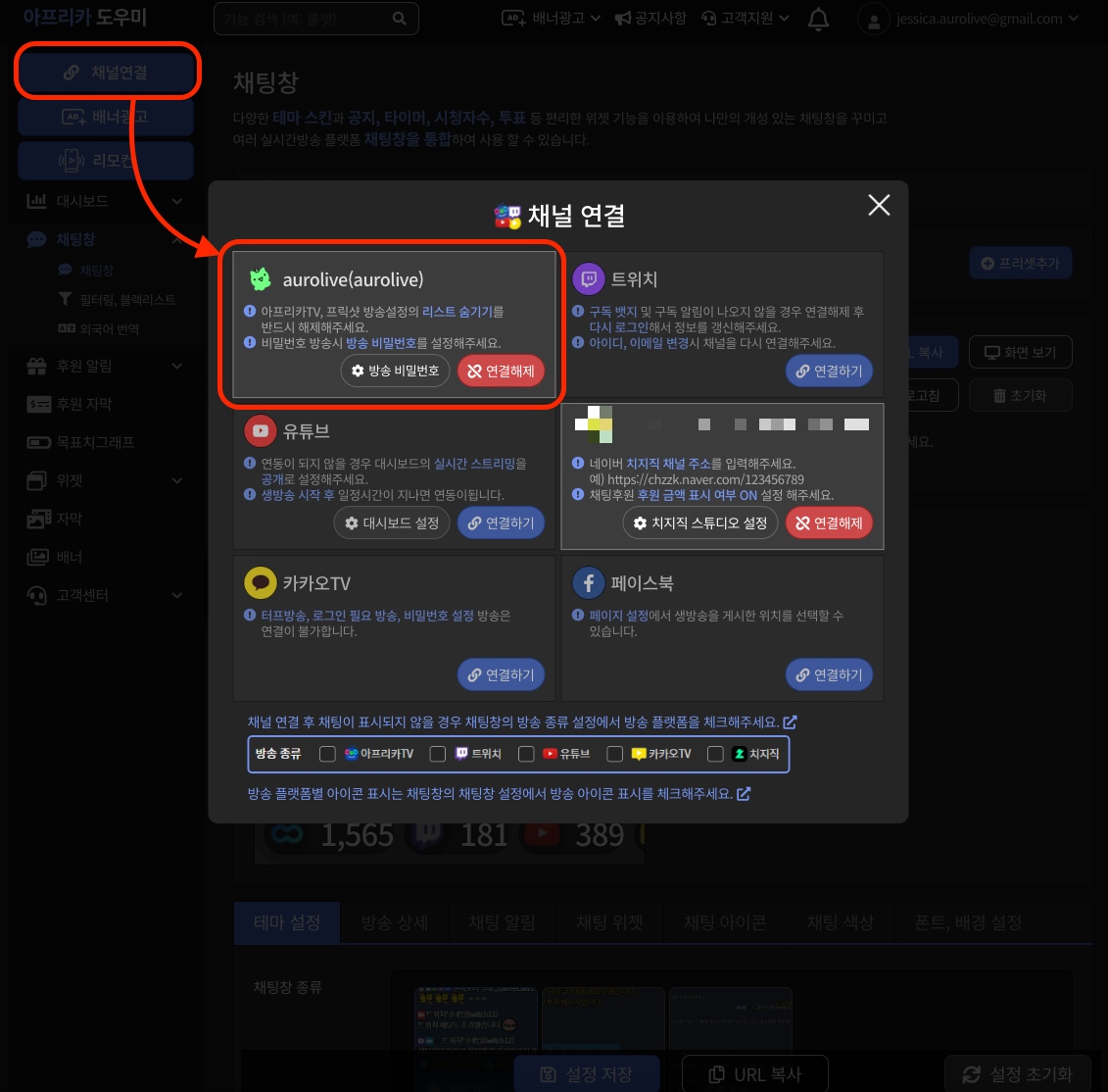 왼쪽 상단에 채널 연결에서 아프리카 채널을 연결해 주세요.