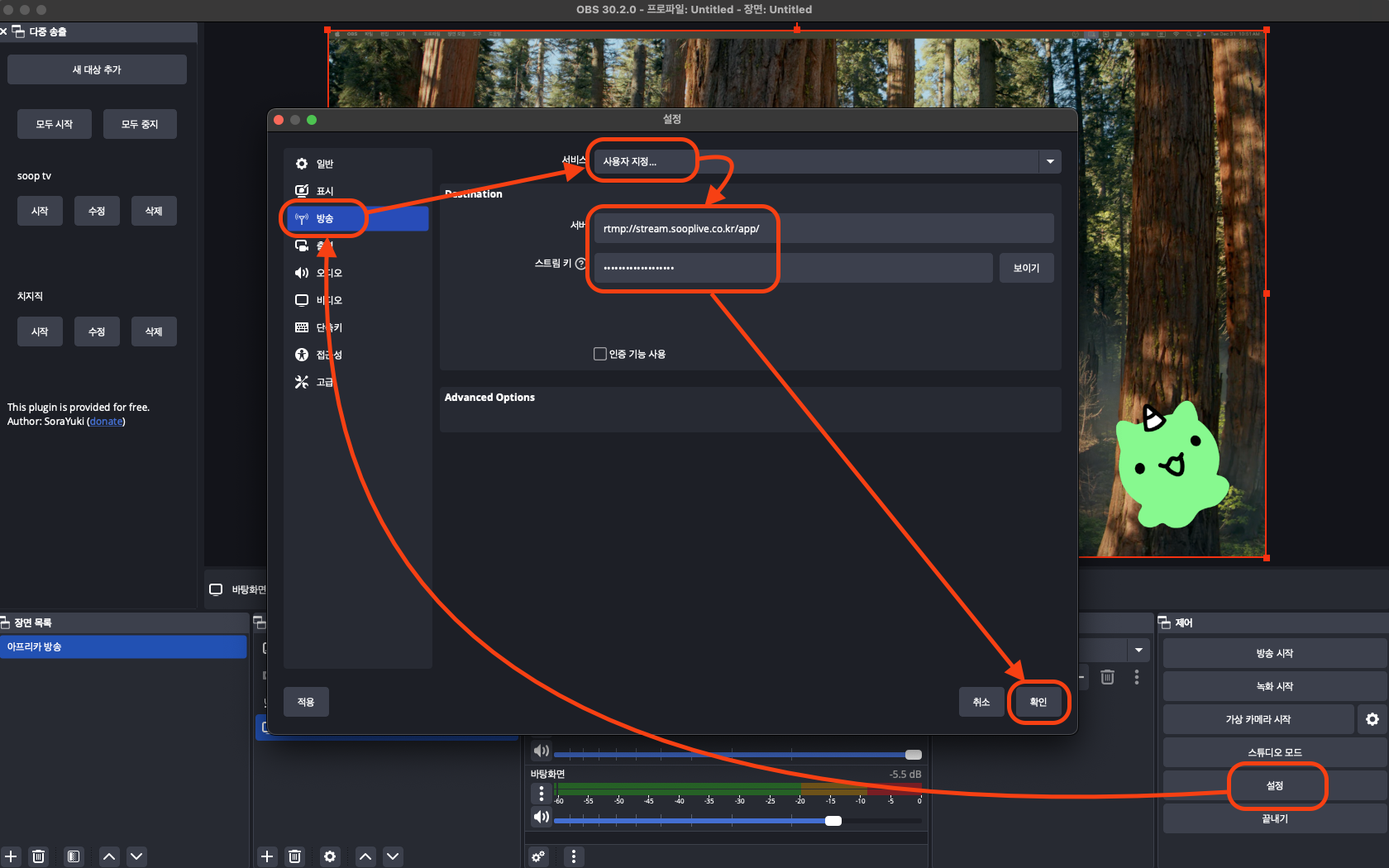 설정 👉 방송 👉 사용자 지정으로 설정 👉 복붙 👉 확인