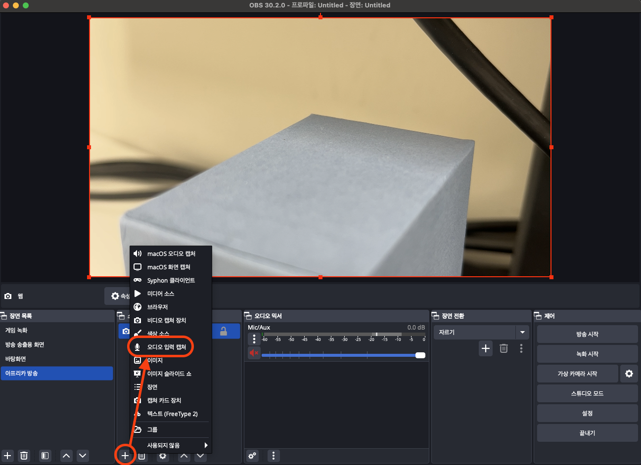 다시 소스목록에서 + 👉 오디오 입력 캡쳐