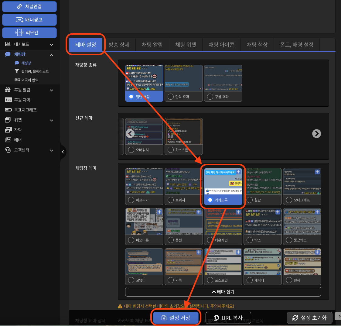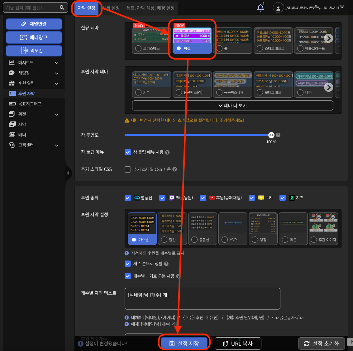 후원 설정 👉 테마 👉 후원 종류 선택 👉 설정 저장