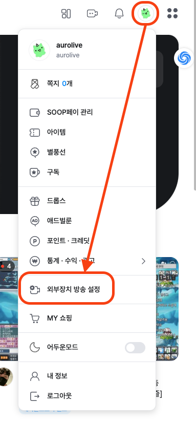 오른쪽 위에 있는 프로필을 클릭해서 '외부장치 방송 설정' 누르고