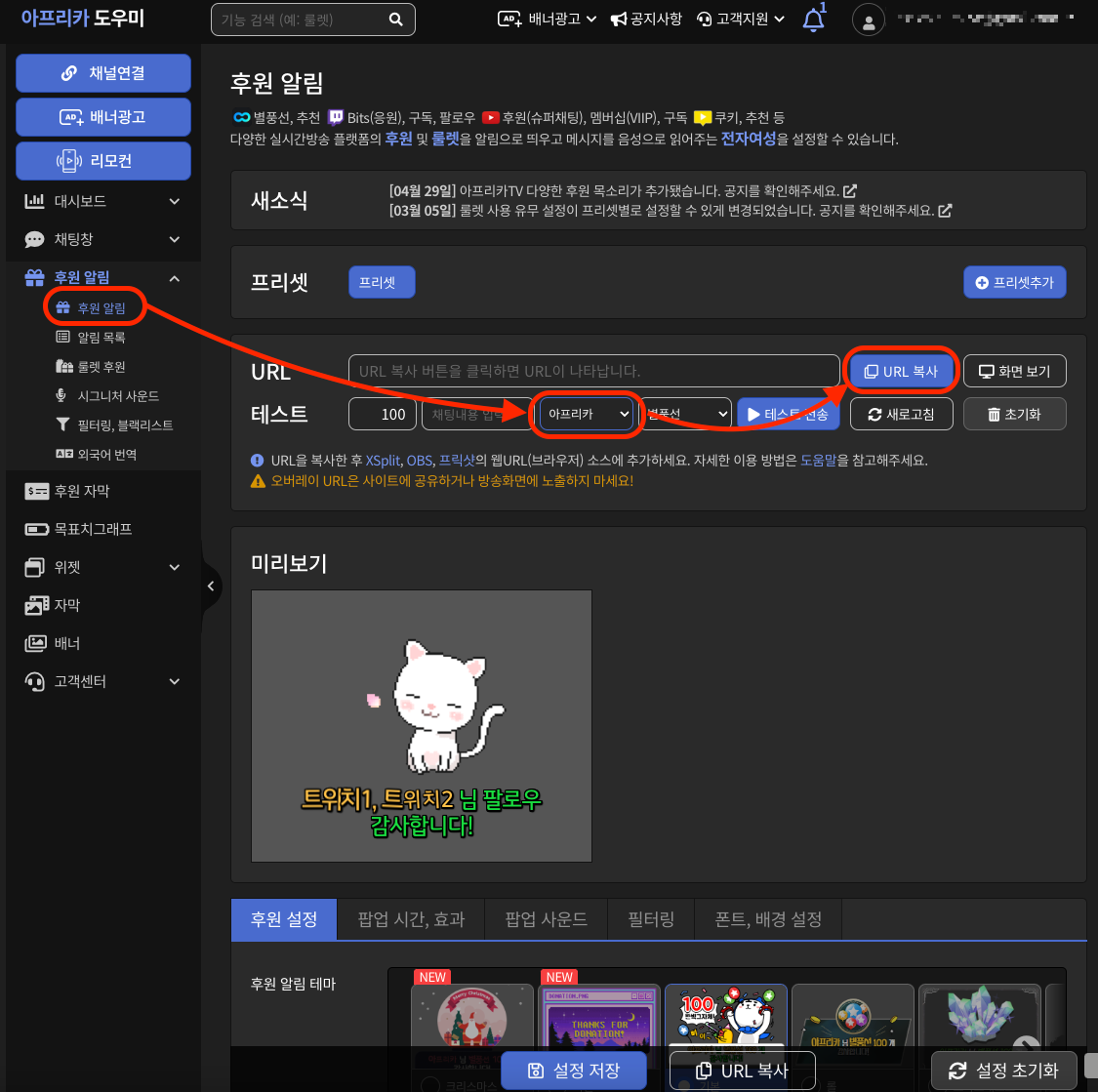 아프리카 도우미에서 후원 자막 👉 아프리카 👉 URL 복사