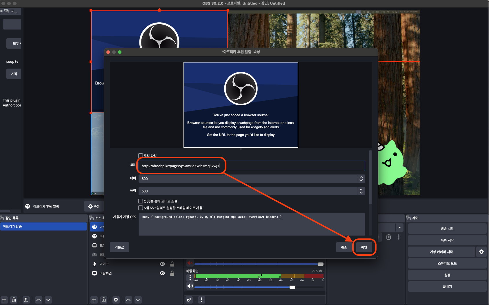 OBS에서 다시 한번 브라우저를 추가해 주고