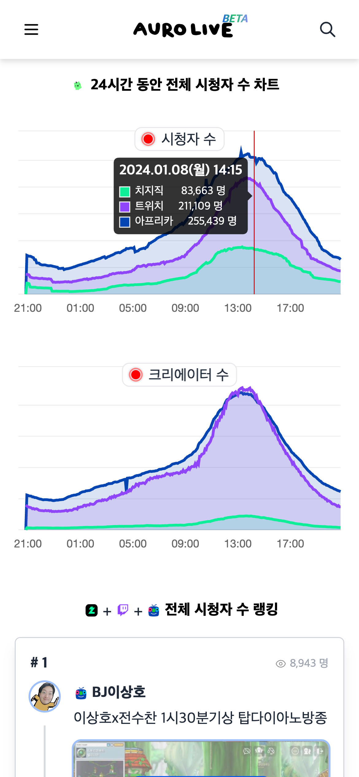 치지직, 아프리카, 트위치 크리에이터의 팔로워 수, 실시간 시청자 수 랭킹